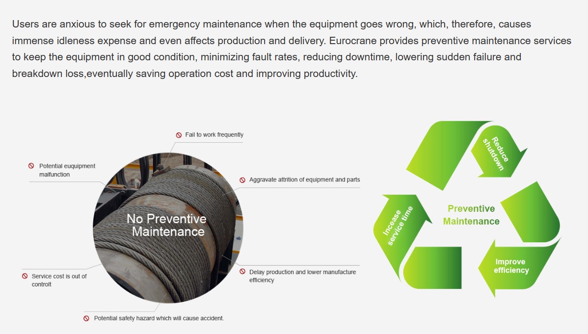 Preventive maintenance monitors and prevents equipment failure. Predictive maintenance predicts possible failure. A routine scheduled preventative and predictive maintenance programs reduce unnecessary and unexpected failures of lifting equipment.